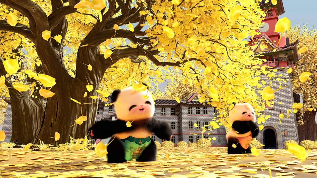 两只大熊猫一路游览,最终停留在华西坝的银杏树下。作为成都唯一保存完好的建筑博物群,华西坝融合了中式园林的古典与西式园林的优雅,是中西文化交流共鉴的成果。